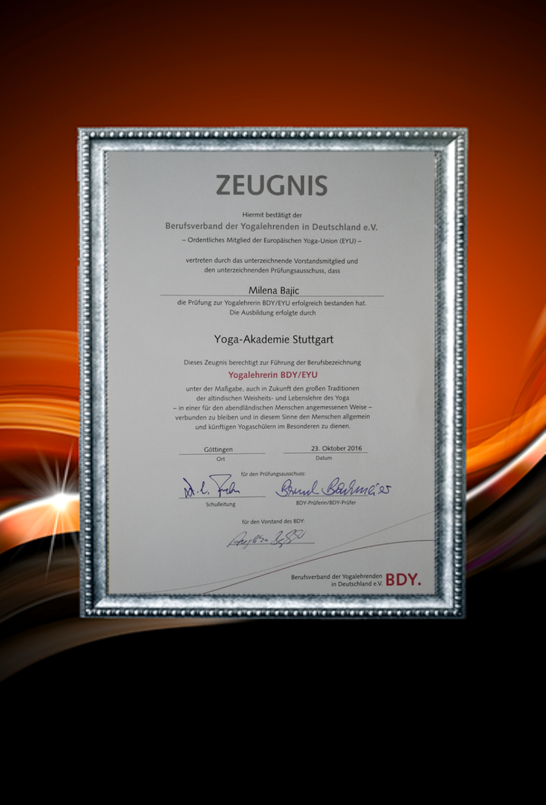 Um den Yoga weg noch besser kennen zu lernen und zu verstehen, habe ich mich deshalb 2012 entschieden, bei Dr. Christian Fuchs an der „Yoga-Akademie Stuttgart“ eine vierjährige Ausbildung zur Yogalehrerin zu beginnen. Diese Ausbildung veränderte mein Leben vollkommen. Ich erkannte das Potenzial und die Kräfte, die ich in mir trage und seit 2015 unterrichte ich nun Yoga und es erfüllt mich mit großem Glück, die Menschen für den Yoga weg zu begeistern und das Wissen und die Erfahrungen, die ich jahrelang gesammelt habe, weiter zu geben.